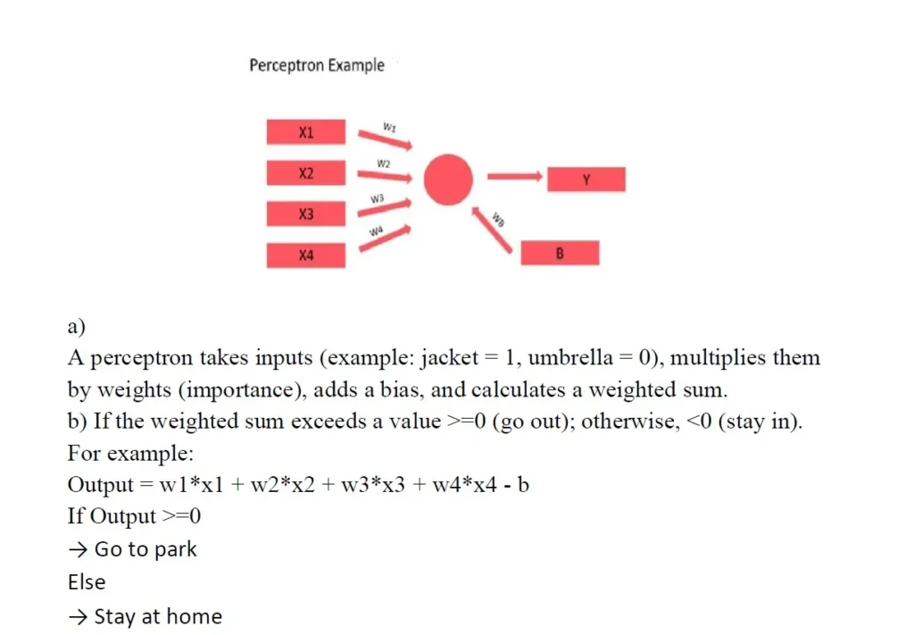 a) A perceptron takes inputs (example: jacket = 1, umbrella = 0), multiplies them by weights (importance), adds a bias, and calculates a weighted sum.