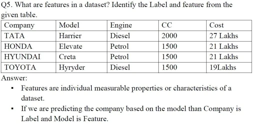 5. What are features in a dataset? Identify the Label and feature from the given table.